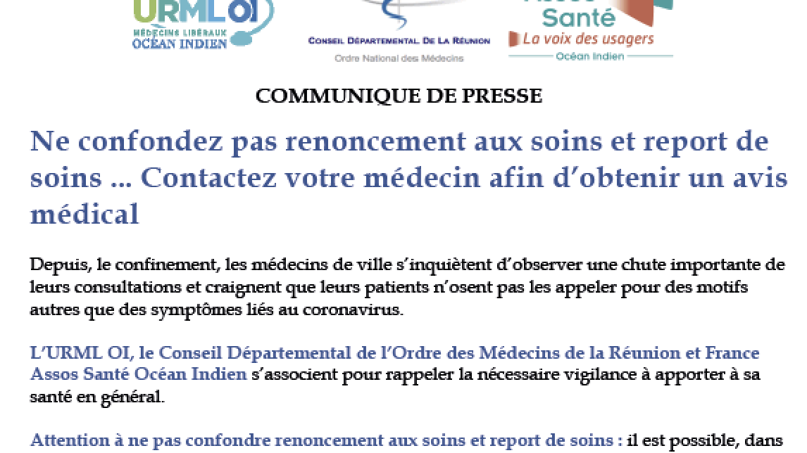 L’URML OI, le Conseil Départemental de l’Ordre des Médecins de la Réunion et France Assos Santé Océan Indien se sont associés pour rappeler la nécessaire vigilance à apporter à sa santé en général. Le communiqué est paru le 9 avril 2020.