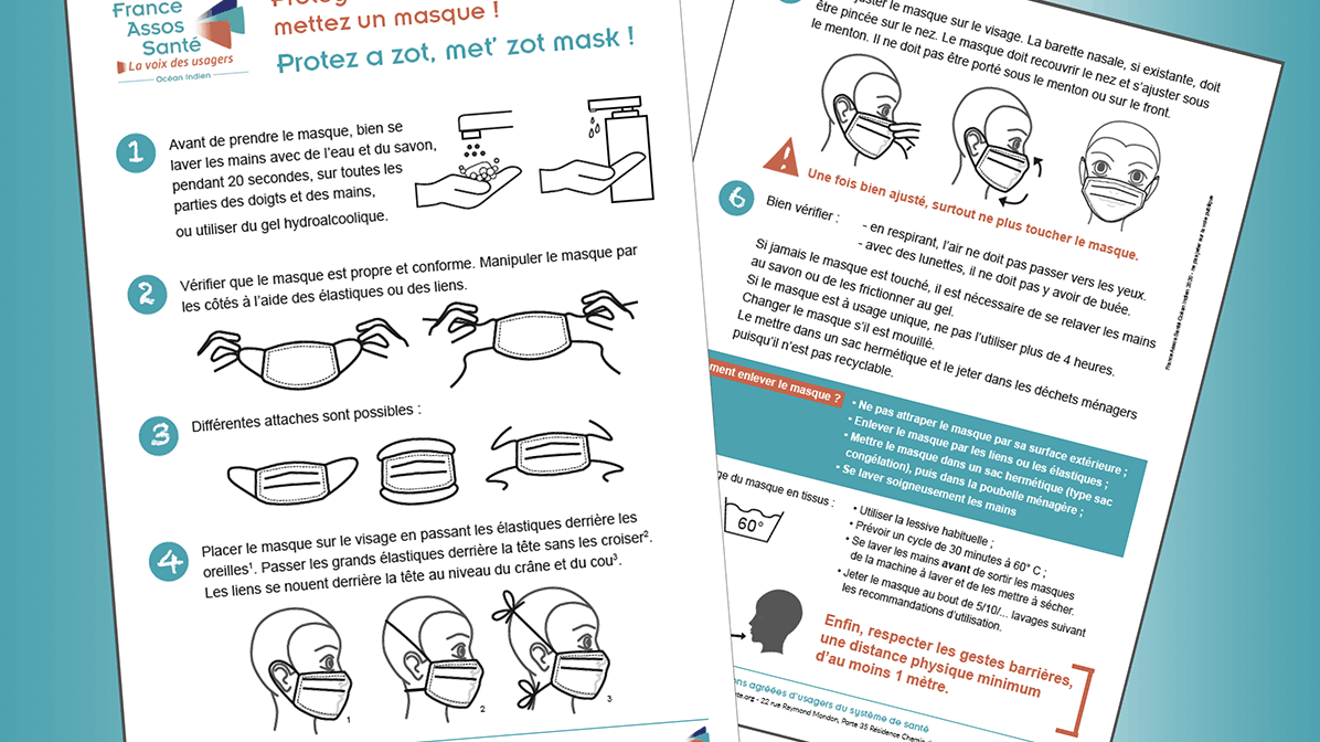 France Assos Santé Océan Indien a réalisé un document support pour accompagner le port du masque. Il décrit, étape par étape, comment bien positionner son masque et l’enlever. Pendant la période de déconfinement, le port du masque est obligatoire dans différents lieux publics, dans les transports en commun, pour aller dans votre laboratoire médical ou chez votre dentiste.