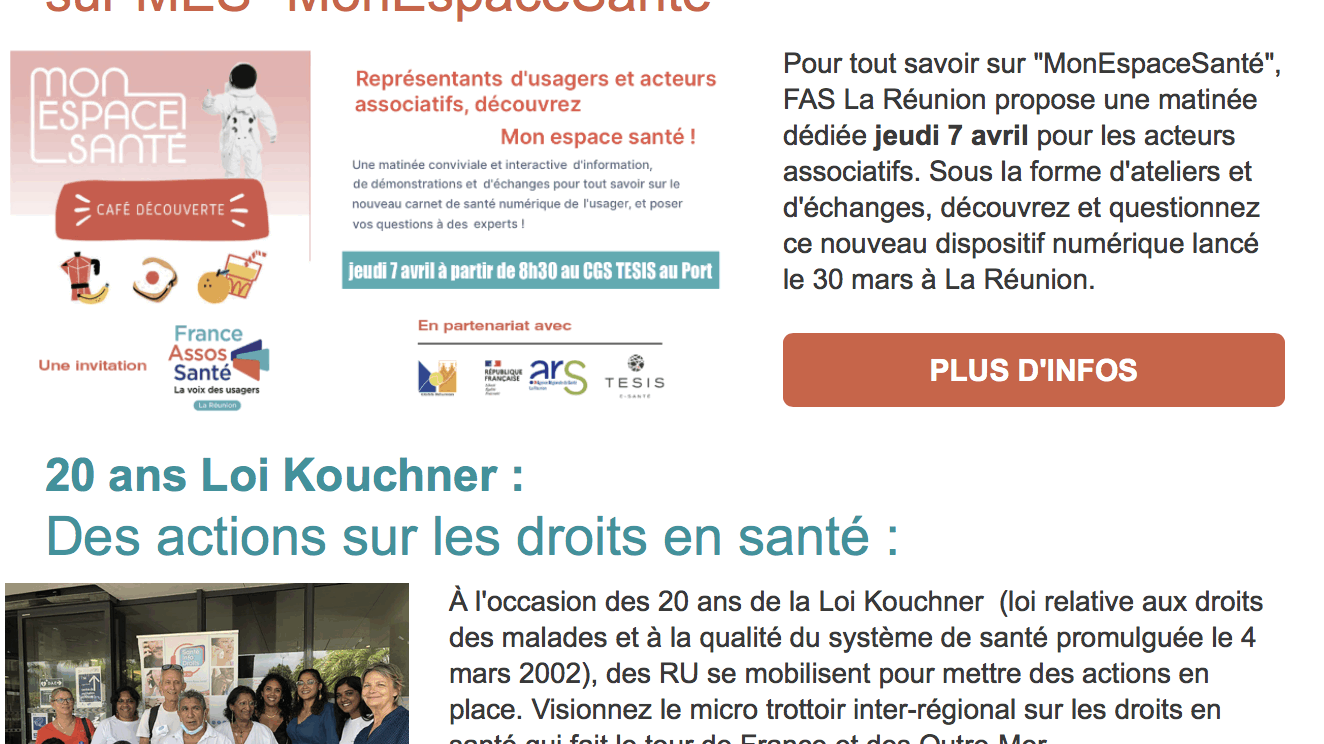 Cliquez sur la têtiaire pour prendre connaissance de la lettre d’information #5, édition de janvier à mars 2022 Oups ! Nous n’avons pas retrouvé votre formulaire. Nos dernières actualités Journée des Usagers : Santé Mentale – Accès aux Soins et aux Droits25 mars 2026Lire la suite RU « RESSOURCES » réseau FRANCE ASSOS SANTÉ LA RÉUNION24 février 2026Lire la suite FICHE-BILAN « démocratie en santé » 202523 février 2026Lire la suite PrécédentSuivant