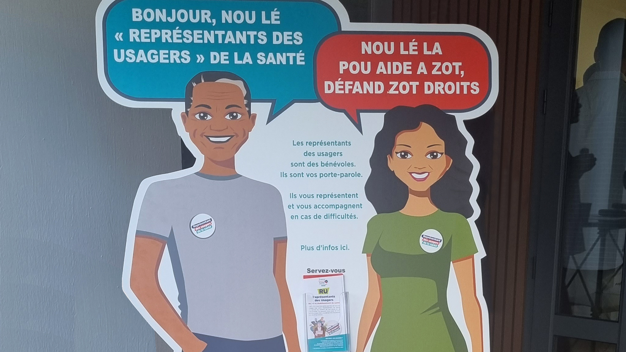 La silhouette des représentants des usagers (RU) à taille réelle représente deux RU disponibles pour accueillir et aider les usagers de l’établissement de santé, défendre leurs droits en santé. Elle est idéalement installée à l’accueil pour être visible de tous. Les personnages invitent les usagers à venir les rencontrer avec les deux bulles de dialogue situées au-dessus de leurs têtes : « Bonjour, nou lé représentants des usagers », « nou lé la pou aide a zot, défand zot droits ».