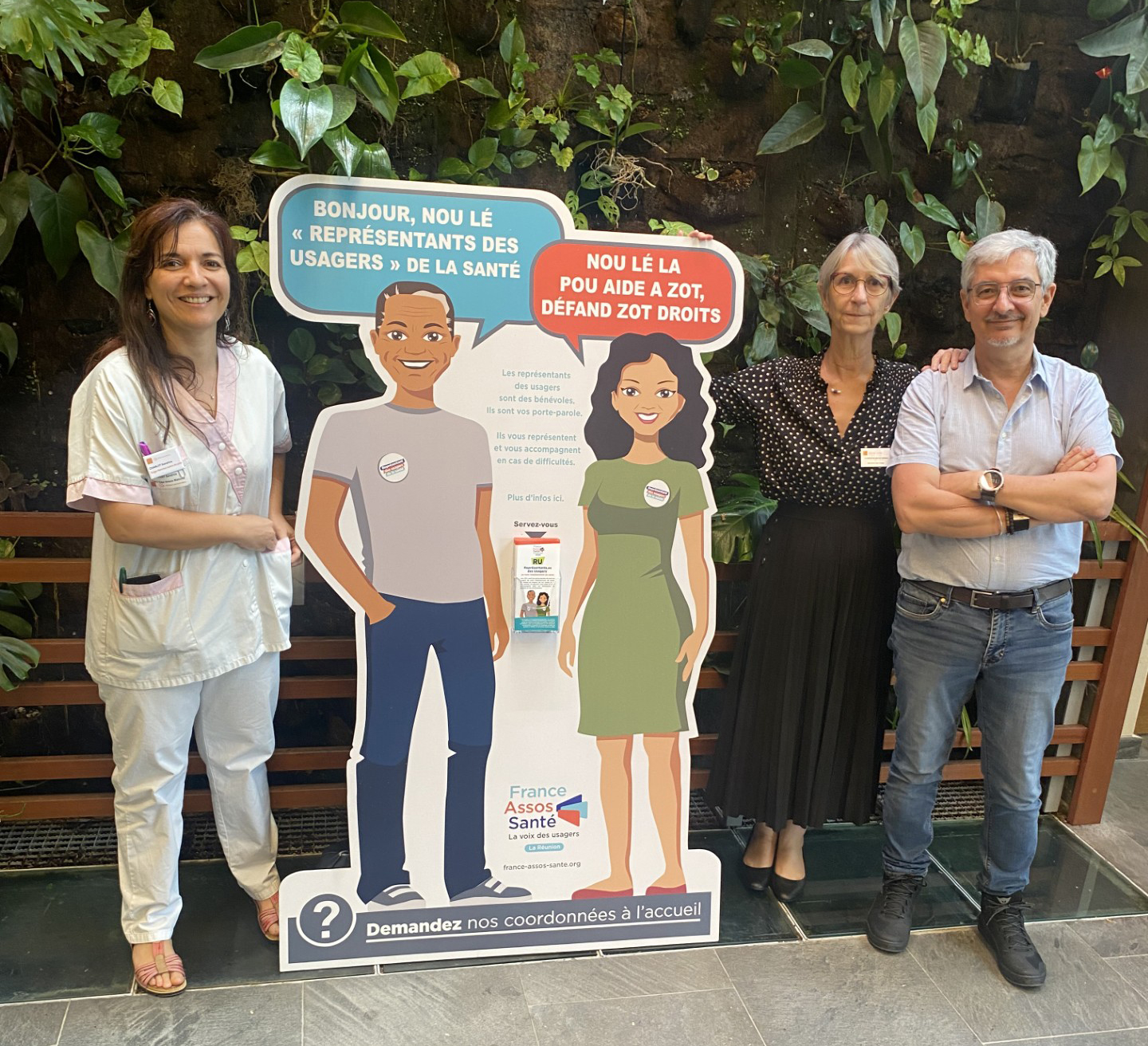 France Assos Santé La Réunion a créé en 2023 des silhouettes RU en PVC à taille humaine dans le but de donner de la visibilité aux représentants des usagers (RU) présents dans tous les établissements de santé de l’île. Tous les établissements seront dotés d’un exemplaire sur demande. Cette action de communication participe à faire connaître les RU dans l’établissement et auprès des usagers et s’inscrit dans le plan stratégique de France Assos Santé La Réunion 2023-2026.