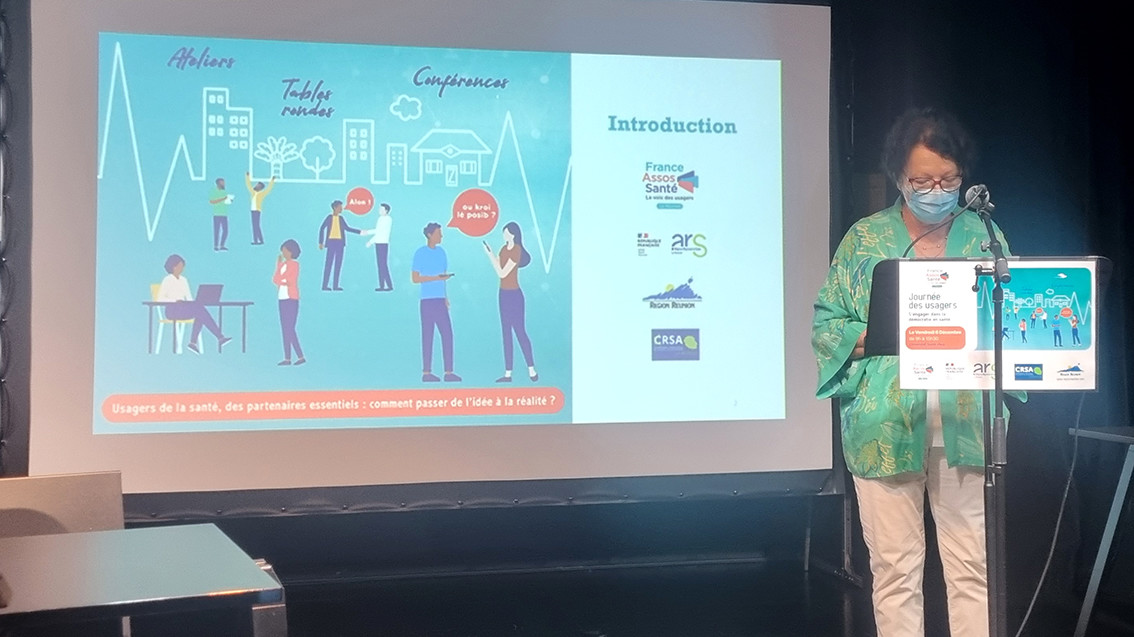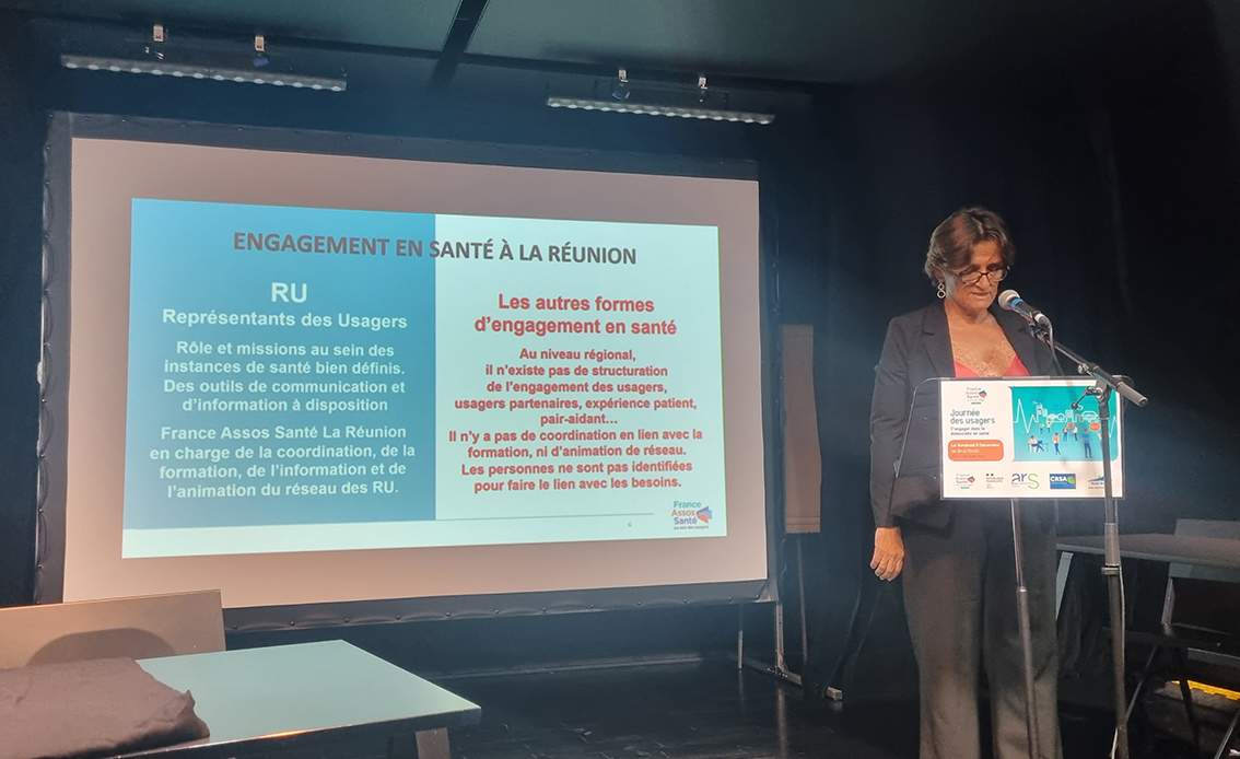 « Cette journée est placée sous le thème de « s’engager dans la démocratie en santé ». Elle reflète une ambition forte, celle de faire de l’usager un acteur à part entière de notre système de santé. On a tous conscience qu’il faut souligner le rôle de France Asso Santé qui fait le lien entre tous les partenaires dans cet engagement collectif… Nous sommes là pour être une voix forte et légitime vis-à-vis de ceux qui vivent au quotidien les réalités de notre système de santé et qui traversent les difficultés. » Laetitia Lebreton, Région Réunion et présidente de la CRSA