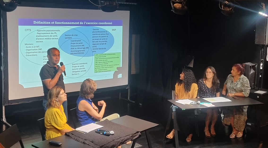 « L’exercice coordonné, c’est une famille de trois structures, des CPTS : communautés professionnelles territoriales de santé ; les MST, maisons de santé pluriprofessionnelles et les CDS : centres de santé« . Le DAC, le Dispositif d’Appui à la Coordination, vient aider toutes ces structures à trouver une solution quand le parcours est complexe. A La Réunion, il existe une réelle dynamique territoriale. Il y a des facteurs et des enjeux de santé qui encouragent à associer les usagers dans l’exercice coordonné. Leur place est-elle être dans la gouvernance des structures, dans la co-construction du projet de santé fondateur de ces structures ou la co-construction des projets qui peuvent être amenés à porter plusieurs projets en santé tout au long de son fonctionnement ? » Chantell FENIES