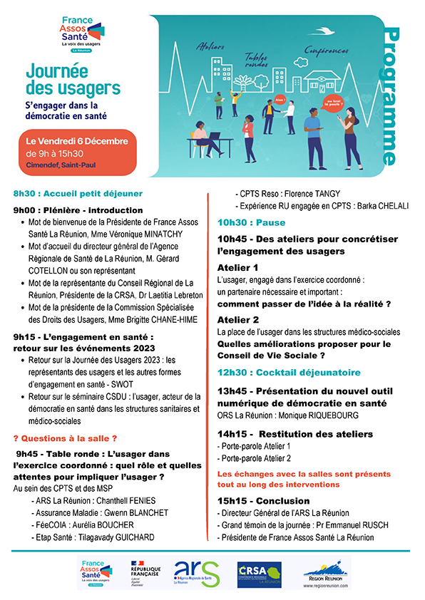 La journée régionale des usagers 2024 sur le thème : « s’engager dans la démocratie en santé » a eu lieu le 6 décembre au Cimendef à Saint-Paul. L’objectif est de conforter la place de l’usager dans son rôle et ses missions. Légitimer la place de l’usager reste un défi, que ce soit dans la co-construction du projet de santé, dans le parcours ou encore dans la gouvernance des associations de l’exercice coordonné. Faciliter les interactions avec les professionnels et les usagers à différents niveaux d’intervention et d’engagement dans l’exercice coordonné. La volonté est également de réfléchir à comment mieux s’engager dans les conseils de vie sociale (médico-sociale) en bénéficiant de l’expérience des représentants des usagers dans les commissions des usagers du domaine sanitaire.
