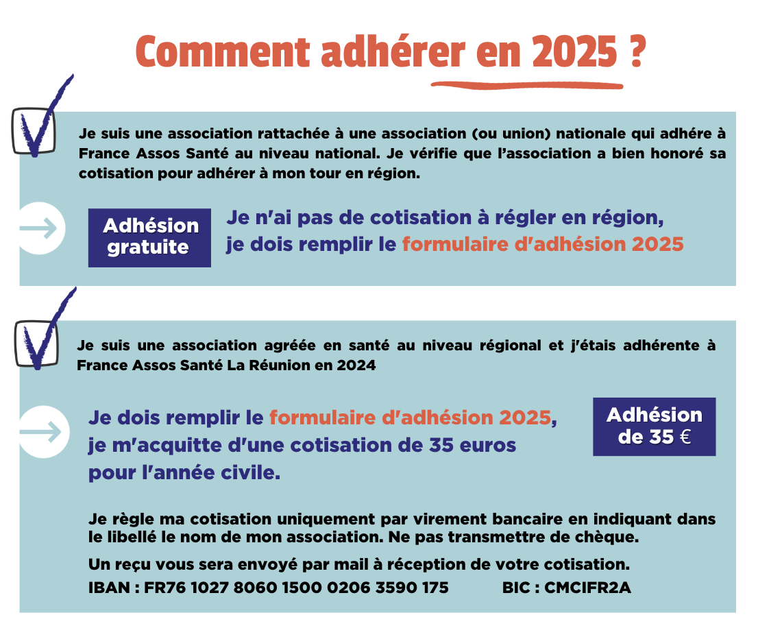L’adhésion 2025 à France Assos Santé La Réunion est ouverte à toute association agréée du système de santé, désireuse de rejoindre notre union et partageant notre charte des valeurs.