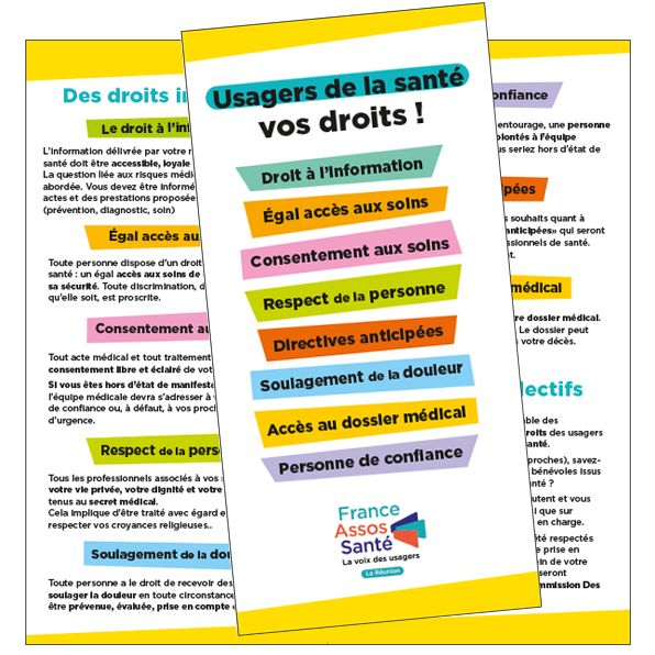 - Des fiches Faciles à Lire et Comprendre (FALC) sur les 4 grandes familles de droits : « J’ai le droit d’être bien soigné », « J’ai le droit de savoir », « J’ai le droit de dire mes remarques et mes réclamations», « J’ai le droit d’être d’accord ou de refuser mes soins ». Conçues par 4 délégations régionales de France Assos Santé (Bretagne, Grand Est, Guyane, Hauts-de-France), ces documents visent à toucher un public le plus large possible, sans exclusion ;