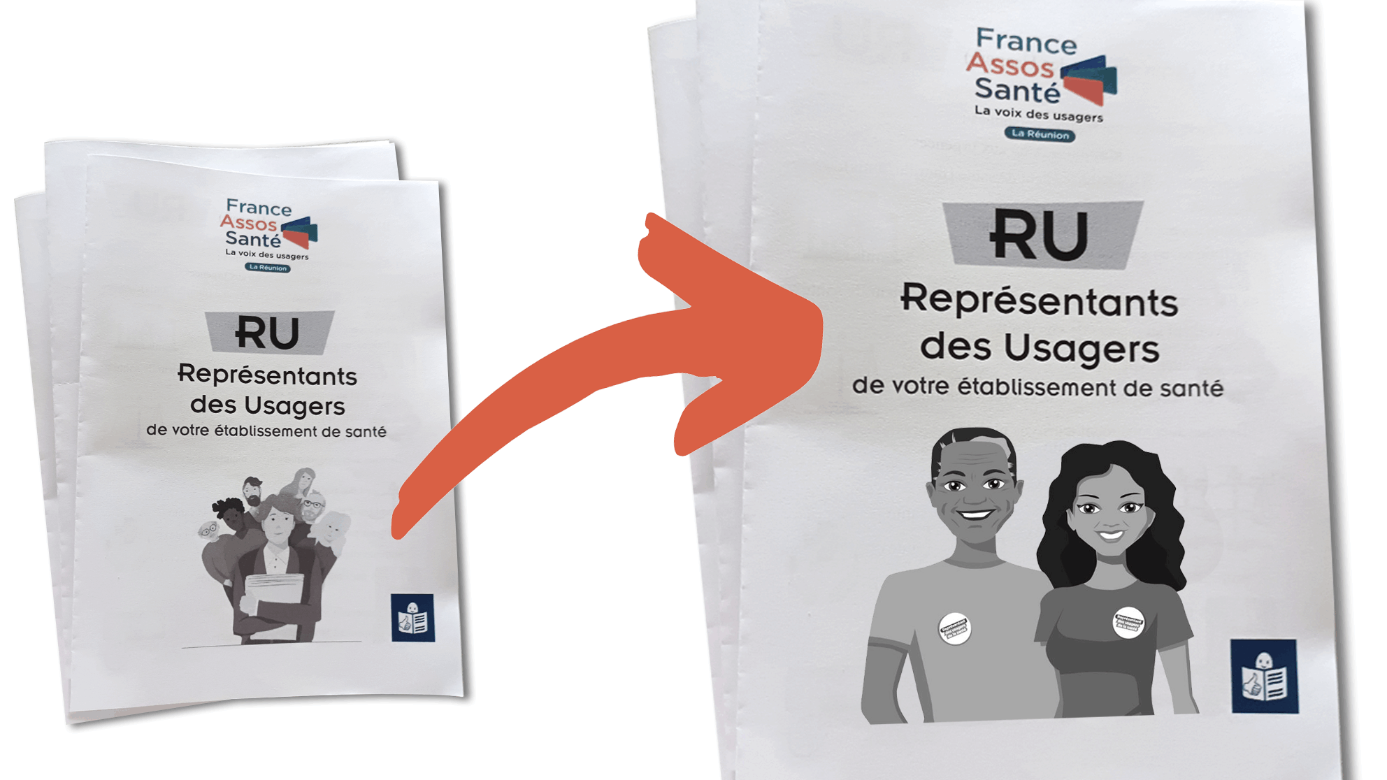 La plaquette des représentants des usagers en FALC (Facile à Lire et à Comprendre) se pare d’un nouveau visuel pour correspondre à l’illustration des silhouettes RU à taille humaine présentes dans les halls d’accueil des établissements de santé de l’île.