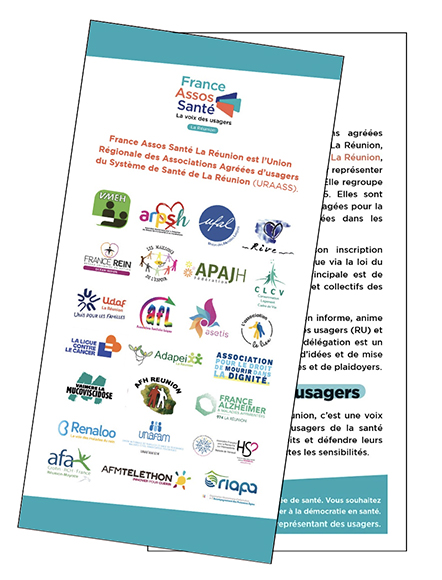 Le flyer de France Assos Santé La Réunion a pour but de mettre en valeur toutes les associations membres de l’Union Régionale des Associations d’Usagers du Système de Santé. Elles sont au nombre de 24 en 2025 et sont toutes identifiées par leur logo et leur objet principal. Le document informe brièvement sur les missions principales de la délégation La Réunion : information, animation du réseau, formations dont la formation obligatoire des RU.