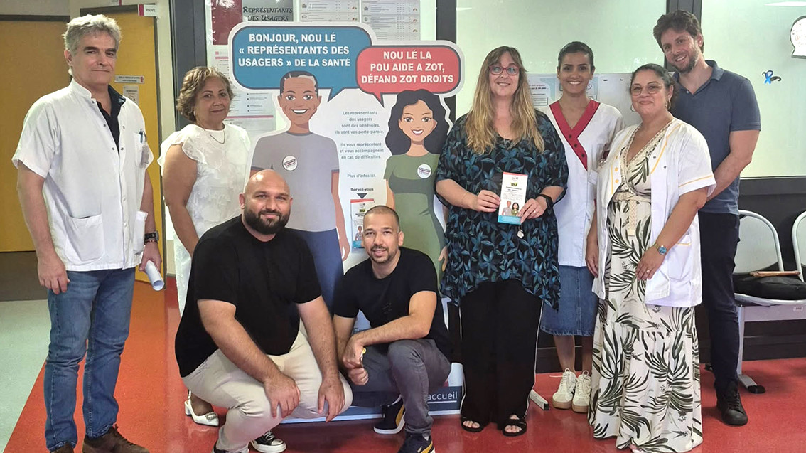 De gauche à droite : Dr SUZON Lionel, médecin en HDJ ; Madame CATREN Aline, directrice d’établissement ; Monsieur TURPIN Michel, coord. MT ; Monsieur CLAIN Fabien, responsable des soins ; Madame CARRASCO Valérie, RU pour l’AFA Crohn RCH ; Madame NOEL Mégan, responsable des soins ; Madame HOARAU, assistante sociale ; Monsieur HACHAICHI Belhassen, responsable Qualité.